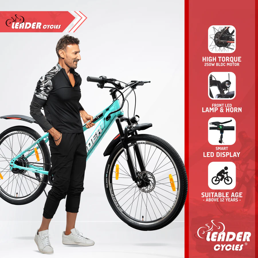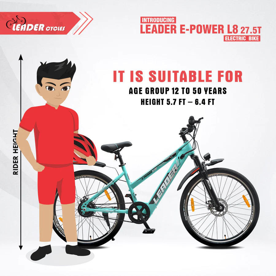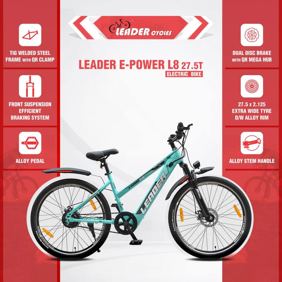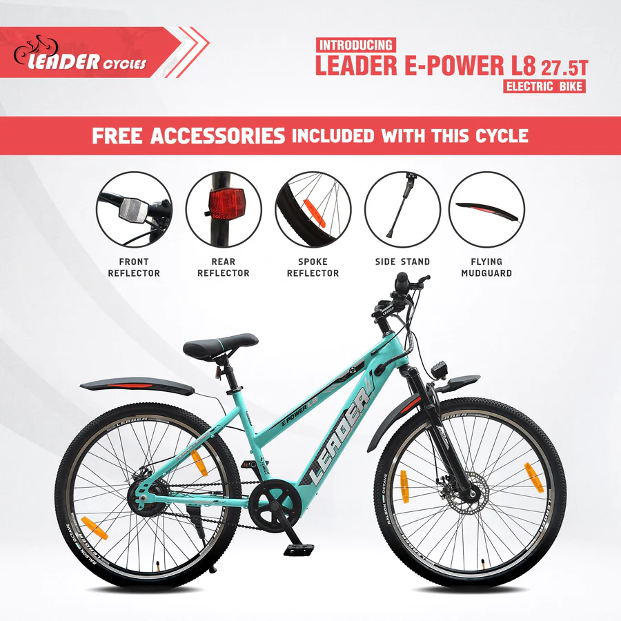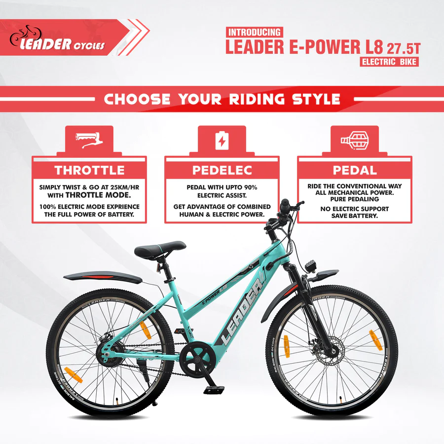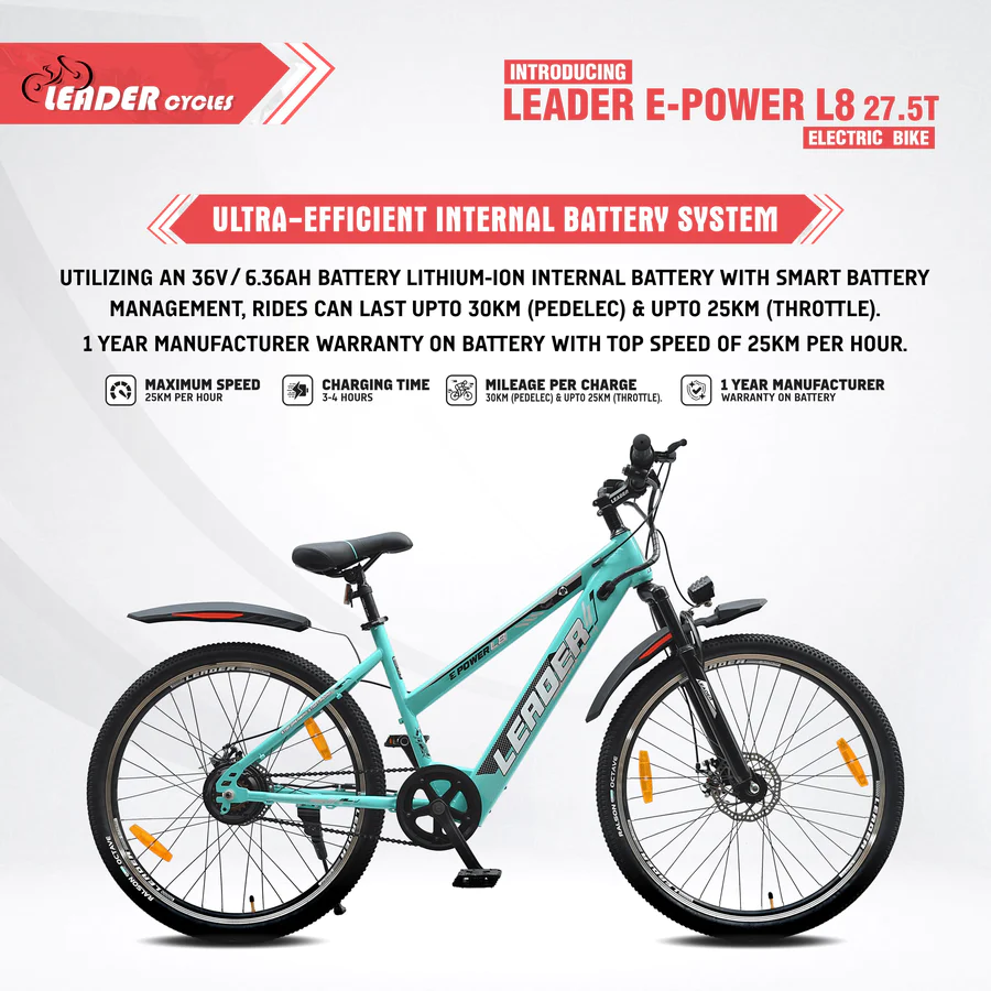 The Leader E-Power L8 27.5T Electric Bicycle runs on a 250W motor and a 36V 6.36Ah battery for a 25 km throttle and 30 km pedelec range. Charging is quick at 3-4 hours, and its LED display keeps you in the loop. With a top speed of 25 kmph and reliable disc brakes, it ensures a safe and efficient ride. The L8 is a sleek, practical choice for those looking for straightforward performance in an electric bicycle.