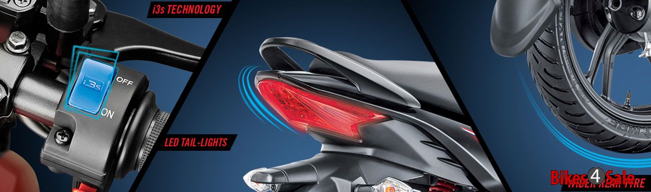 Hero MotoCorp had developed an 'Idle Stop-Start System' known by the name "i3S" technology for their commuter range of bikes. This system helps the bike in achieving better fuel economy and reduction in the exhaust emissions during traffic jams or signal stops. The 'i3S' system can be turned off or on with the help of a blue-colored i3S switch, positioned on the right-hand side.