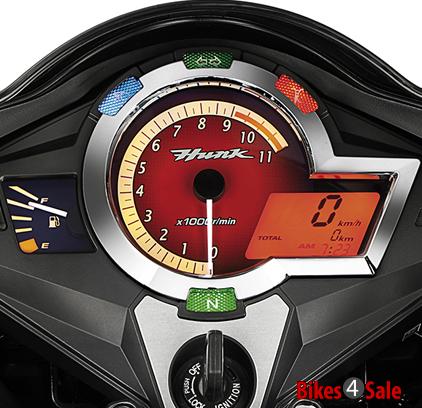 The all digital instrument cluster displays all relevant details like speedometer, tachometer, fuel gauge and even side stand indicator lights as well. Hero Hunk is closely matched with their close relative CB Unicorn Dazzler in various aspects. The shape of fuel tank and its cowl are similar to the Hunk.