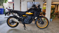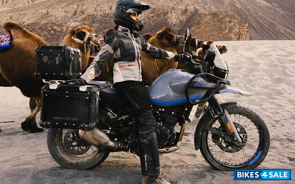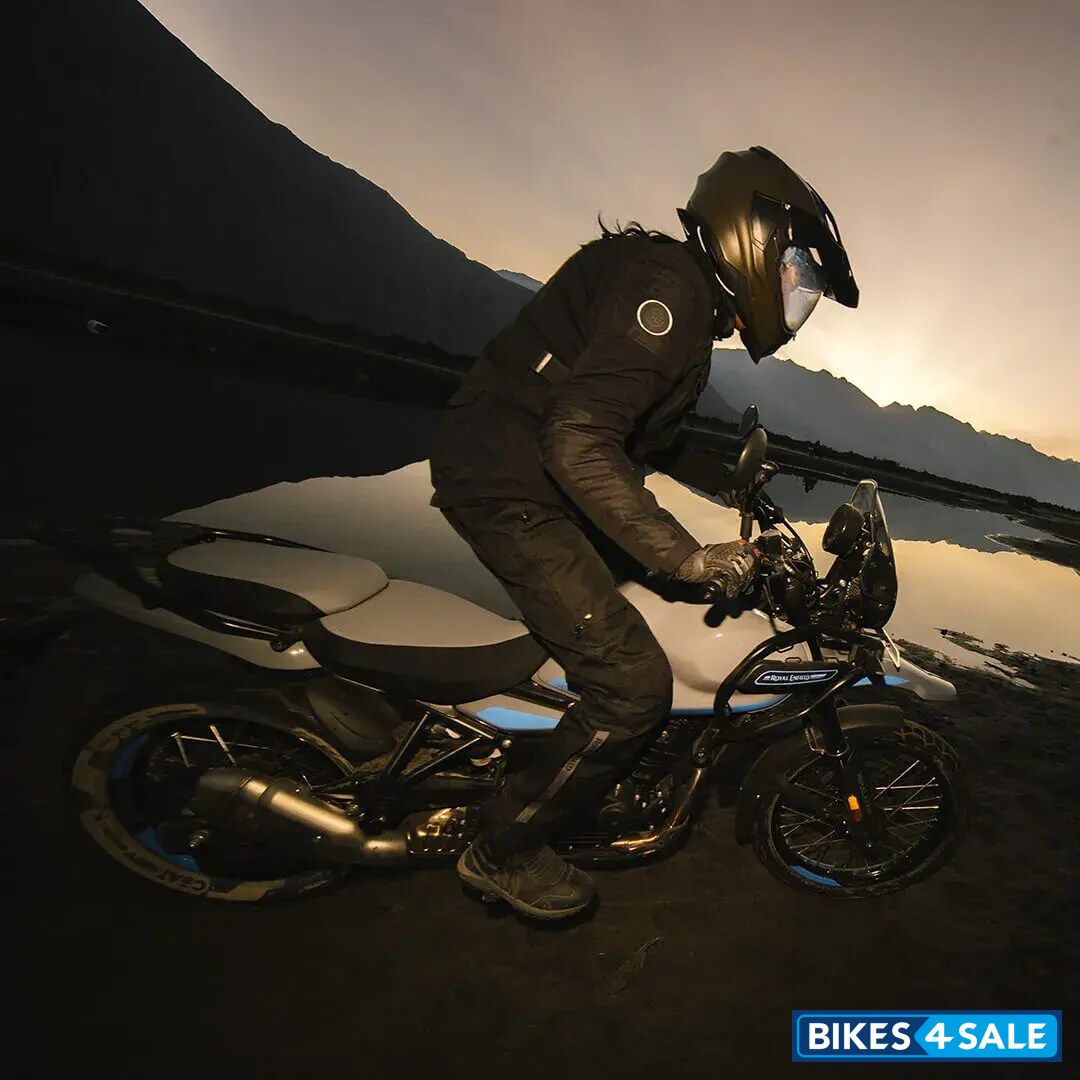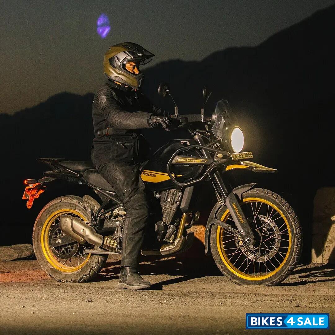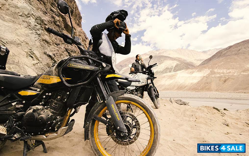 The Royal Enfield Himalayan 450, a dynamic adventure motorcycle, stands out with its 450cc single-cylinder engine. This machine offers 40.02 Ps of power and 40 Nm of peak torque, balancing off-road agility and on-road comfort seamlessly. It's equipped with a 320 mm front disc brake and a 270 mm rear disc, complemented by switchable dual-channel ABS, ensuring responsive control and safety.